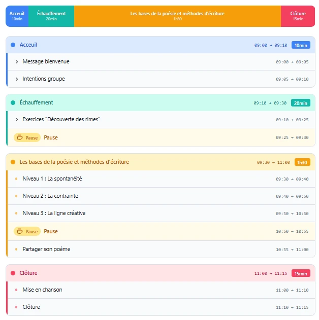 Les temps seront parfois en groupe, parfois en binôme et parfois en solo. Il y a très peu de moments théoriques, et il y a plusieurs petites pauses.